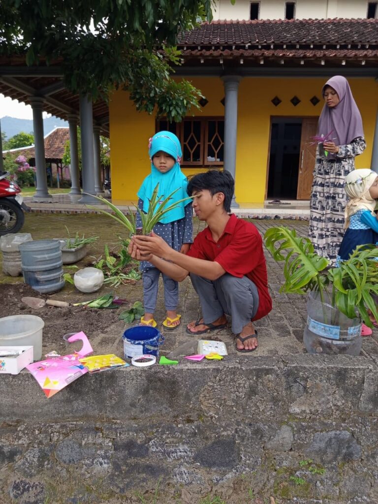 Sesi pertama dimulai dengan praktik menanam. Para generus diajarkan cara memanfaatkan botol plastik bekas sebagai pot tanaman—sebuah langkah kecil untuk mencintai lingkungan. Dengan bimbingan para pengajar, anak-anak tampak cekatan memasukkan media tanam ke dalam pot yang telah dihias cantik dengan kertas warna-warni bertuliskan nama mereka masing-masing seperti Fauzan, Naya, Lita, dan Rara.