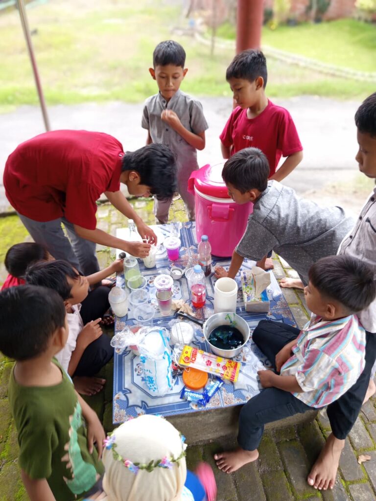 Tak berhenti di situ, keseruan berlanjut ke sesi meracik minuman. Di bawah pendampingan kakak pembina, para santri belajar membuat minuman segar secara mandiri. Mereka belajar mencampur bahan, mengaduk, hingga menyajikan minuman mereka sendiri.